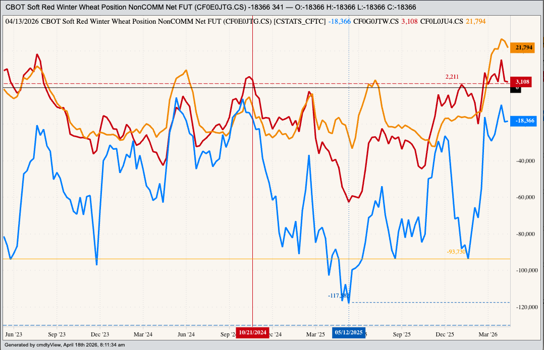 Why would long-term investors be long the WEAT ETF then? Watson – my name for the algorithm-driven global trading industry – is not a rational human being who understands wheat. Based on technical factors like momentum and volatility computers could continue to buy SRW based on headlines tied to completely made-up government numbers (e.g. NASS’ weekly crop condition figures). If so, funds could continue to cover the net-short futures position with the most recent Commitments of Traders report (legacy, futures only) showing 18,366 contracts as of Tuesday, April 14, a decrease of 341 contracts from the previous week.