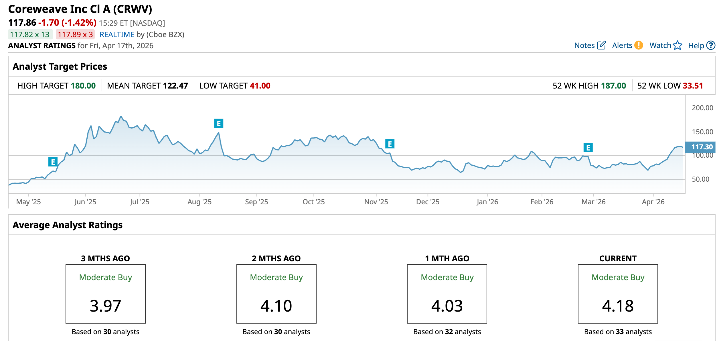 CoreWeave stock has a consensus “Moderate Buy” rating overall. Out of 33 analysts covering the stock, 20 recommend a “Strong Buy,” one gives a “Moderate Buy,” 11 analysts stay cautious with a “Hold” rating, and one advises a “Strong Sell.”