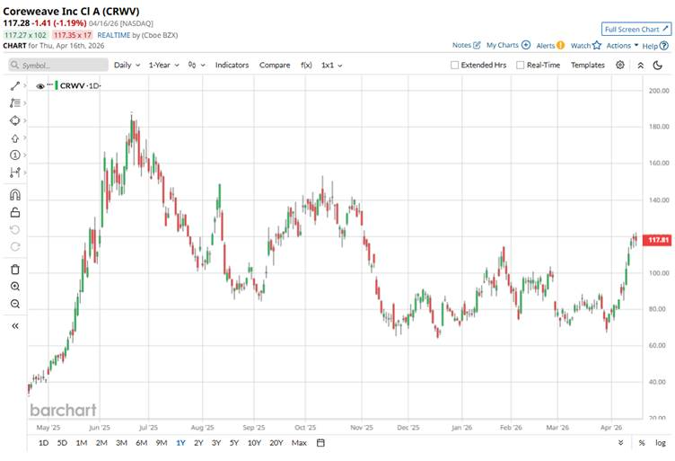 CoreWeave’s stock performance since its IPO has been marked by extreme volatility alongside strong absolute returns. The company went public in March 2025 at $40 per share and quickly became one of the standout AI trades, with the stock’s dramatic rise within months of listing as demand for GPU-backed cloud capacity surged.