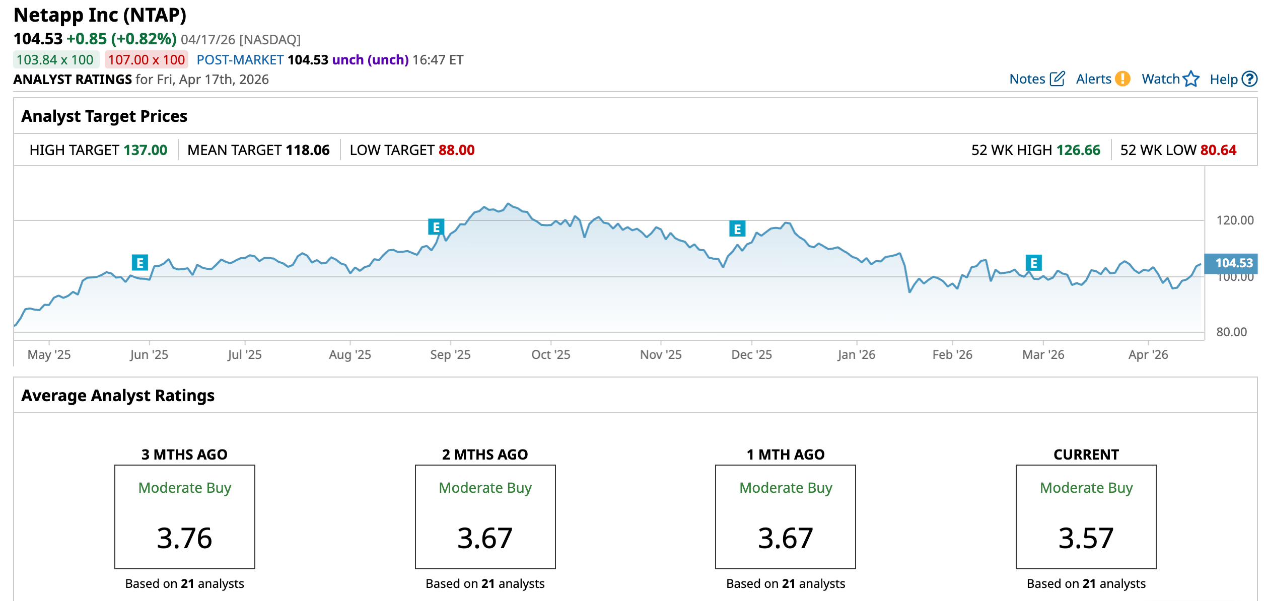The average analyst price target for NTAP is $118.06, indicating potential upside of 12.9%. The Street-high target price of $137 suggests that the stock could rally as much as 36.1% from here.