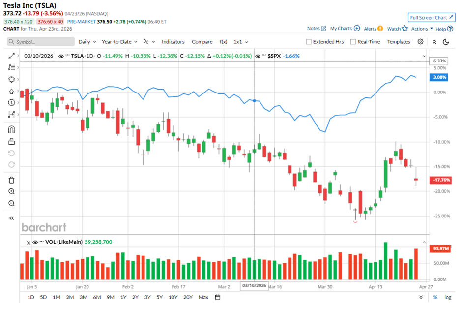 After rallying 45% in 2025, TSLA’s momentum has stalled in 2026, with shares sliding nearly 16.43% year-to-date (YTD), sharply underperforming the S&P 500 Index ($SPX), which is up about 4.67% during the same stretch. The reversal is even more pronounced from its December peak of $498.83, with the stock now down 32.6%, signaling a notable shift in investor sentiment.