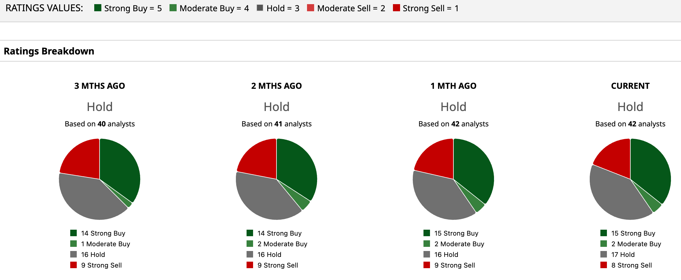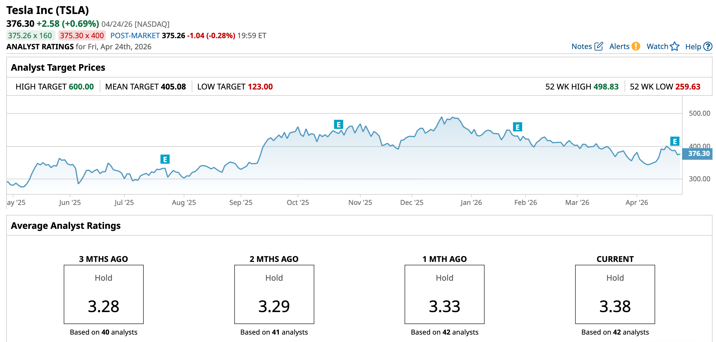 Overall, Wall Street is treading carefully on Tesla, with the stock carrying a consensus “Hold” rating. Out of 42 analysts, sentiment is sharply split, 15 remain firmly bullish with “Strong Buy” calls, two lean “Moderate Buy,” 17 prefer to stay on the sidelines, and eight take a distinctly bearish stance with “Strong Sell” ratings. The average price target of $405.08 suggests a 7.65% upside, but the Street-high target of $600 hints at a far more bullish scenario, implying the stock could rally as much as 59.45% from current levels.