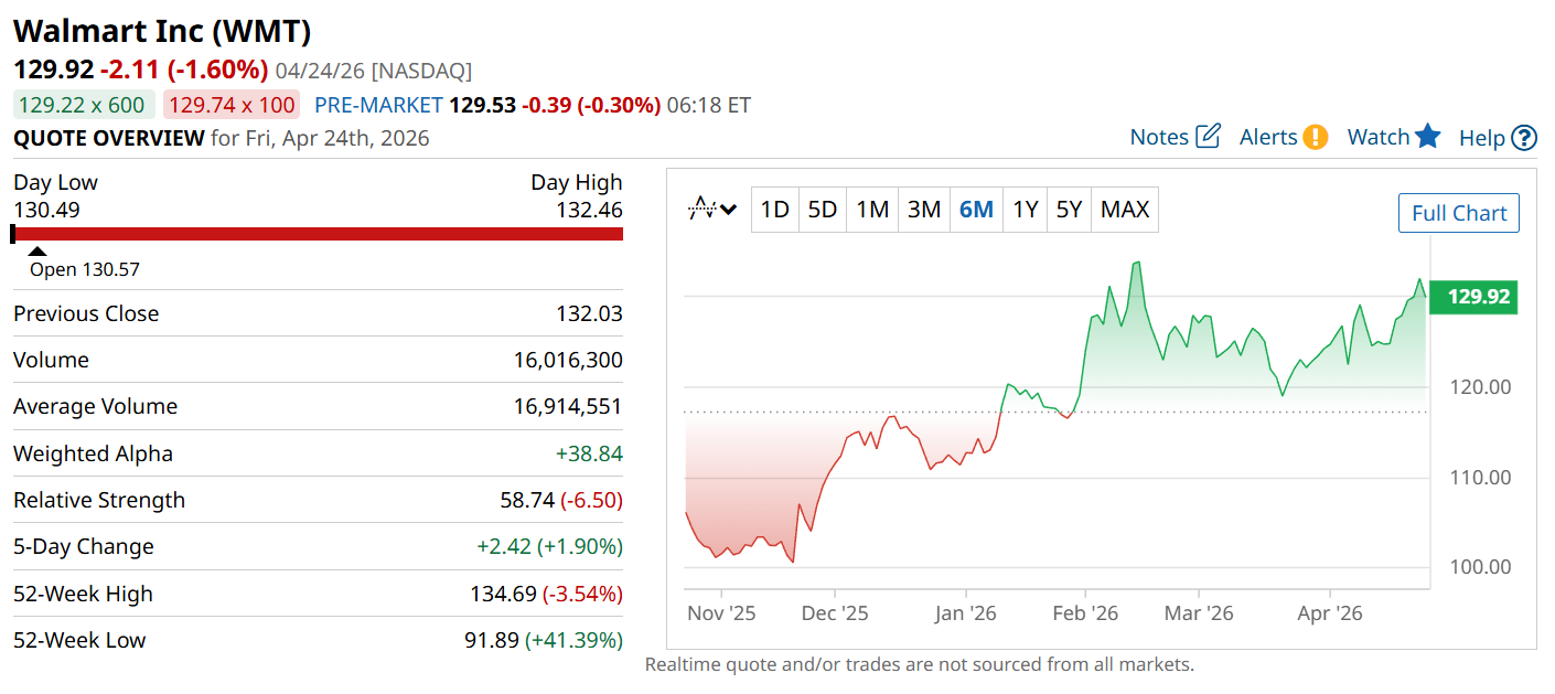 Walmart has increased its dividends for 52 consecutive years, making it a Dividend Aristocrat and King. It pays $0.99 per share per year, translating to around a 0.75% yield. That’s not the highest yields around, but consistency and a strong underlying business more than makes up for it.