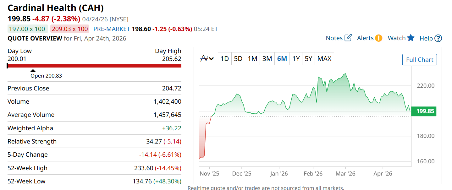 Cardinal Health is a healthcare services company that helps keep the medical supply chain moving. It distributes pharmaceuticals and medical products to different health institutions, ensuring that supplies reach the facilities and patients that need them. Its logistics role also extends to care-at-home through its Velocare solution, which helps scale hospital-at-home programs.