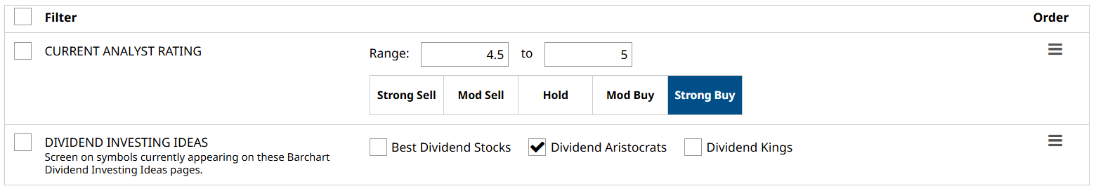 Using Barchart’s Stock Screener, I selected the following filters to get my list: