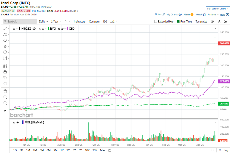 INTC has soared 323.9% over this time frame, well ahead of the broader S&P 500 Index ($SPX), which has rallied 29.8%. In 2026, INTC’s stock popped 130.3% compared to the SPX’s 4.8% rise on a YTD basis.