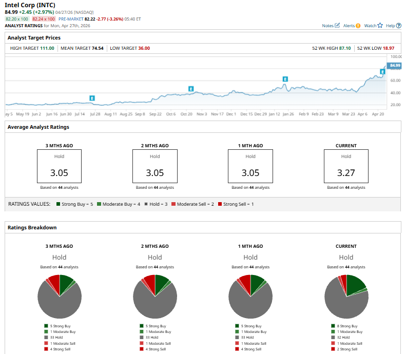Among the 44 analysts covering INTC stock, the consensus is a “Hold.” That’s based on eight “Strong Buy” ratings, one “Moderate Buy,” 32 “Holds,” one “Moderate Sell,” and two “Strong Sells.”