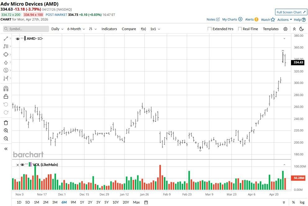 According to Barchart, options data also suggests the semiconductor stock could be trading around $303 just days after its Q1 earnings, indicating potential downside of more than 9% from here.