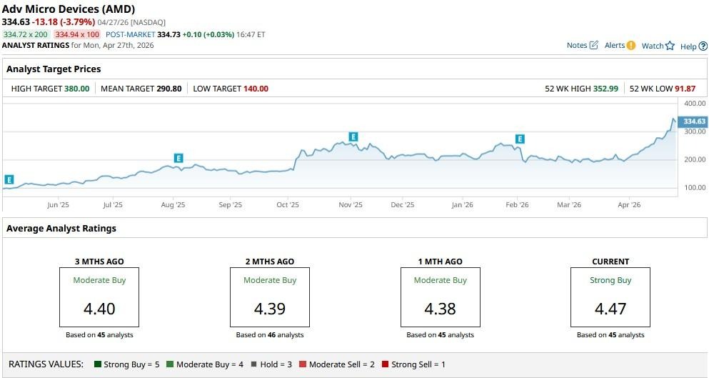 While the consensus rating on AMD shares remains at a “Strong Buy”, the mean price target of about $291 signals potential for another 13% decline from here.