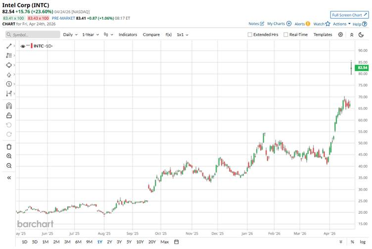 Moreover, on April 24, after Intel delivered a blowout Q1 earnings report, the stock surged 23.6% in a single session, its best daily performance since 1987, hitting a 52-week high of $85.22. The surge signaled that investors are increasingly viewing it as a direct beneficiary of the next phase of AI adoption, particularly inference and agentic workloads, where CPUs play a central role.