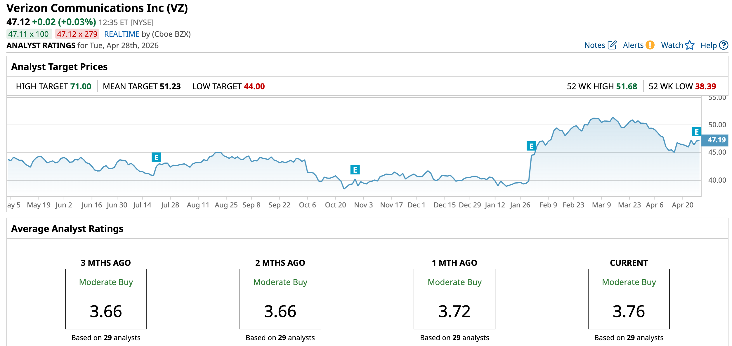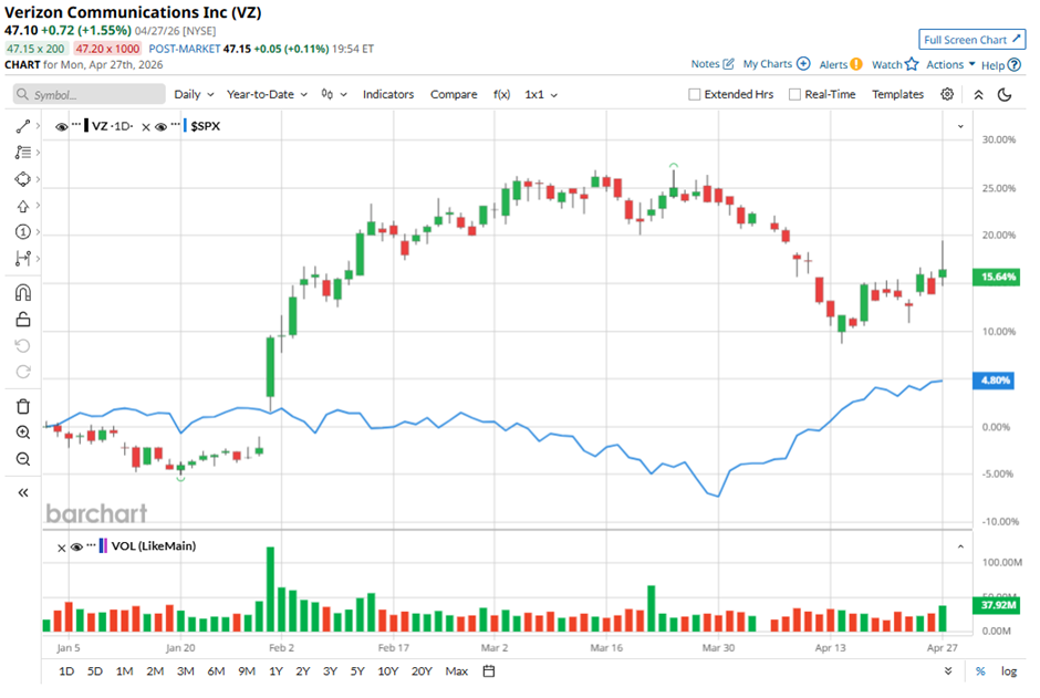 The telecommunications giant has been quietly flexing its strength on Wall Street. With a market capitalization of roughly $196.9 billion, the stock is up an impressive 16% so far in 2026, comfortably ahead of the broader S&P 500 Index ($SPX), which has gained just 4% in the same period. Shares rallied to a 52-week high of $51.68 on March 24, and although they’ve since eased about 8.7% from that level, the stock continues to hold its ground as a notable outperformer in the broader market.