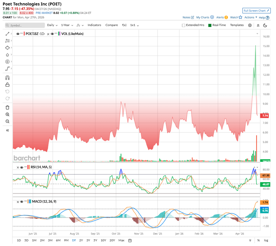 And yet, even after the drop, POET stock remains up 86% over the past 52 weeks, with gains of 28.94% over three months and 54.53% in just the past month. The volatility cuts both ways.