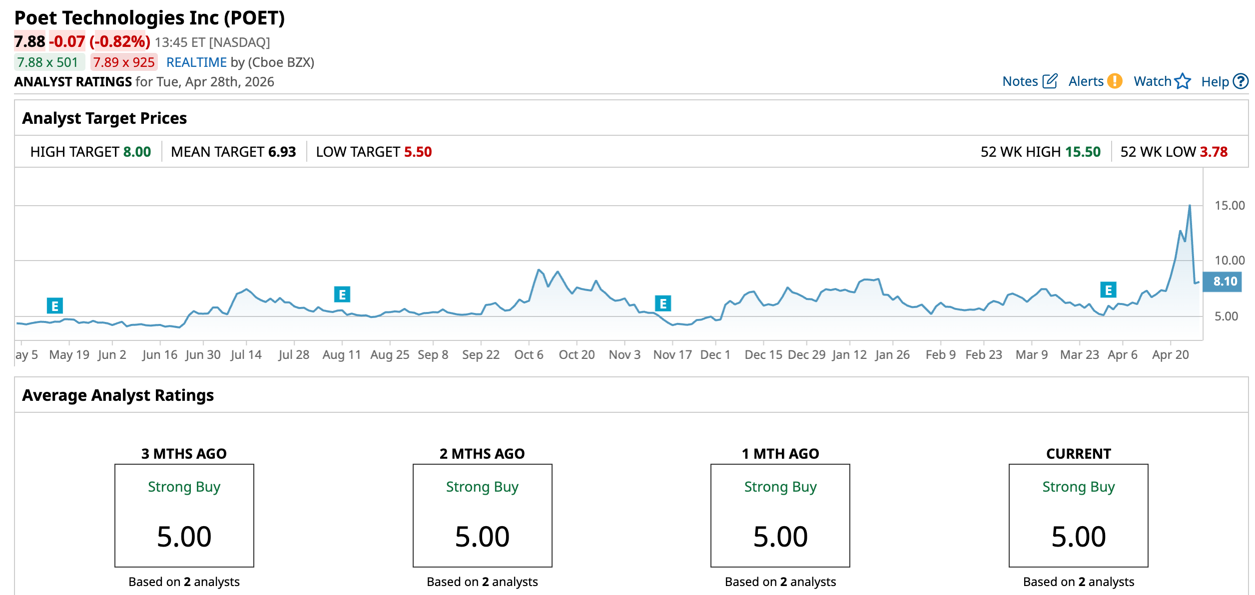 The Street may be quiet on POET stock, but the signal is still bullish. The stock carries a “Strong Buy” rating from the two analysts tracking shares. POET stock is currently trading above the average price target of $6.93 and just slightly below the Street-high target of $8.