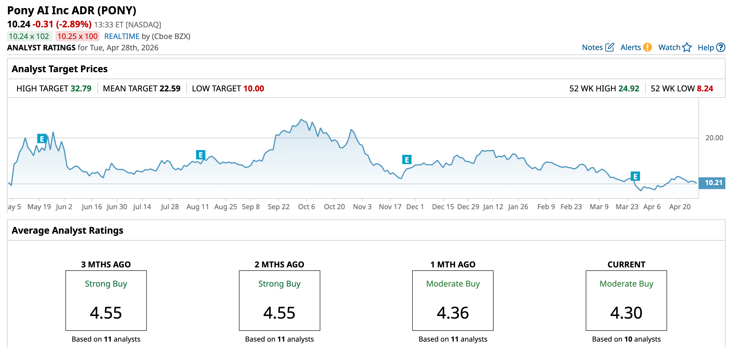 Currently valued at $4.1 billion by market capitalization, Pony AI made its Nasdaq debut in 2024, and while the stock has slipped marginally over the past year, it has stumbled 29.28% in 2026 so far, pressured by mixed quarterly results, lingering profitability concerns, and ongoing U.S.-China tensions.