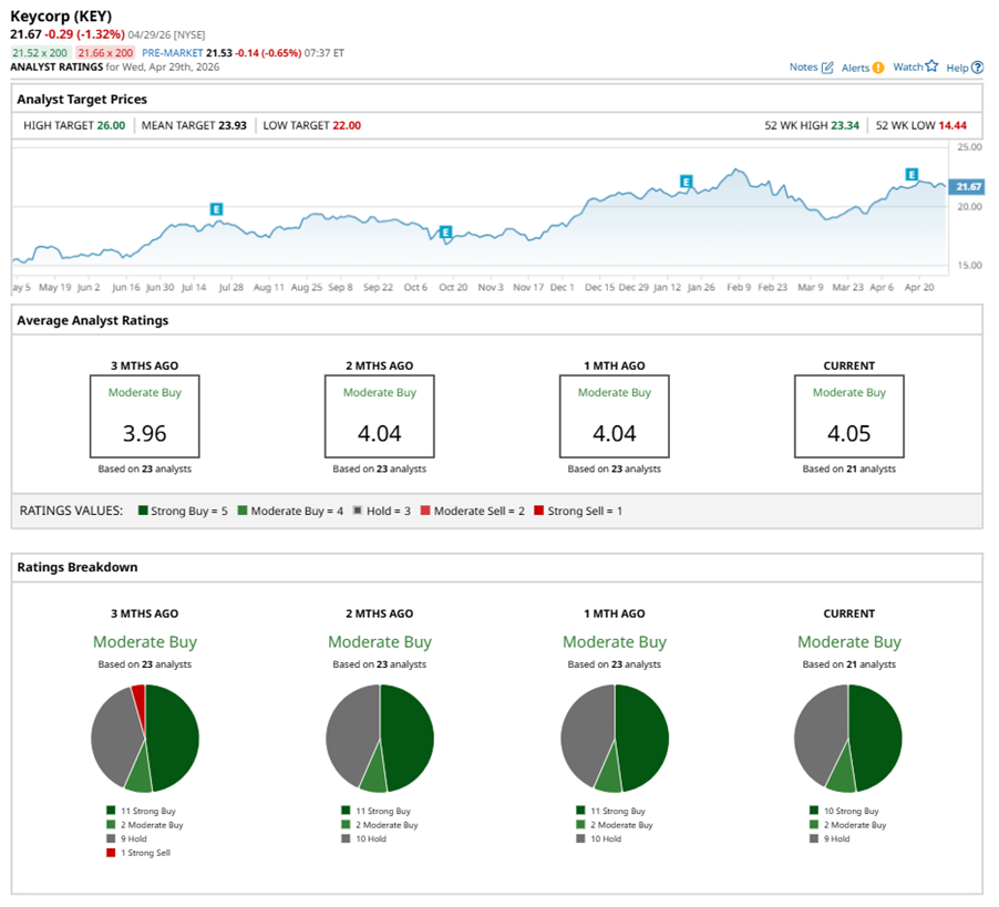 On Apr. 21, Truist Financial Corporation (TFC) kept a “Hold” rating on KEY and raised the price target to $23, implying a potential upside of 6.1% from current levels.