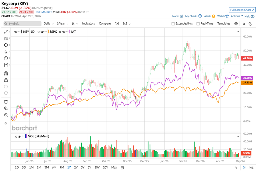 Shares of this leading regional bank have outperformed the broader market over the past year. KEY has gained 45.1% over this time frame, while the broader S&P 500 Index ($SPX) has rallied nearly 28.3%. In 2026, KEY stock is up 5%, surpassing the SPX’s 4.2% rise on a YTD basis.