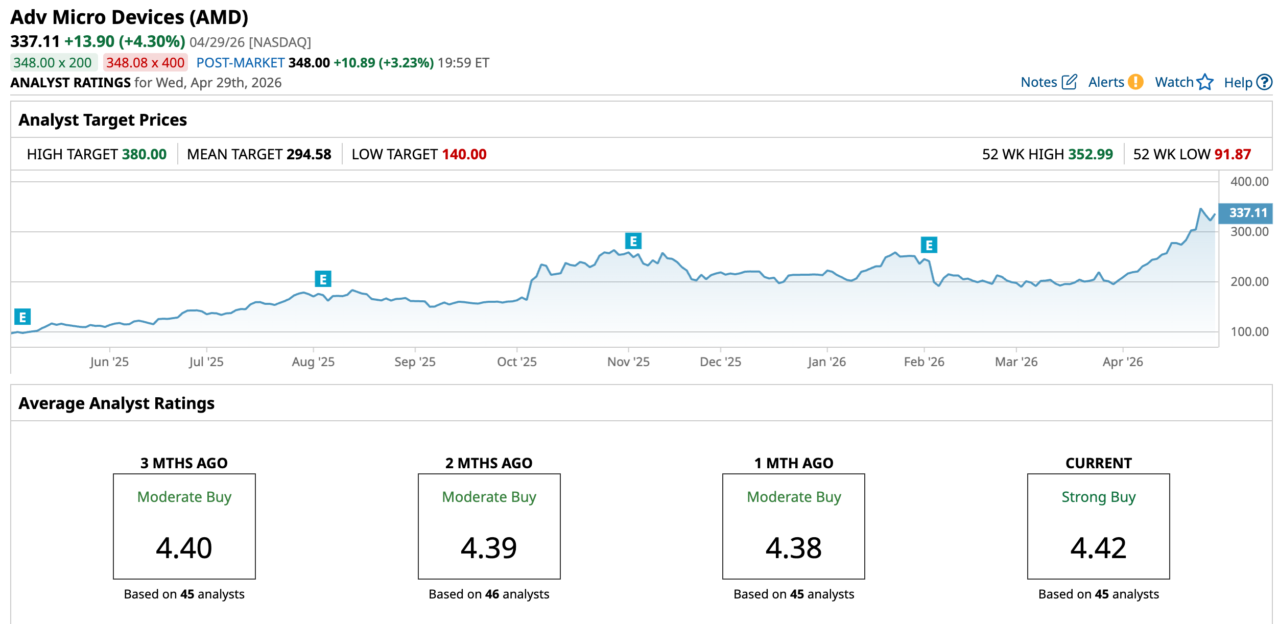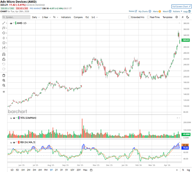 AMD’s stock surged 250.94% over the past 52 weeks on explosive AI GPU demand, deals with OpenAI and Oracle (ORCL), and data center revenue surging to power hyperscale training. The stock is also up 57.41% year-to-date (YTD). It reached a 52-week high of $352.99 on April 24, but is down 4.5% from that level.